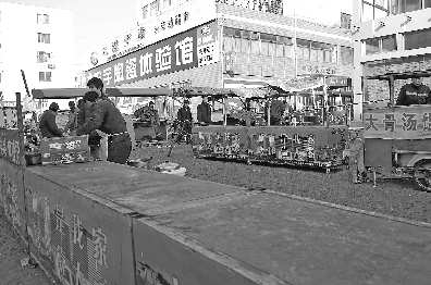 1月26日上午,在黄海三路一小吃聚集处,能容纳十几个摊位的场所才来了三四家。“今天来卖东西的摊主很少,都在家过小年了。”一位出摊的摊主于志波说。“今天卖东西的特别少,我等了很长时间才买了一个饼。”市民张先生说。