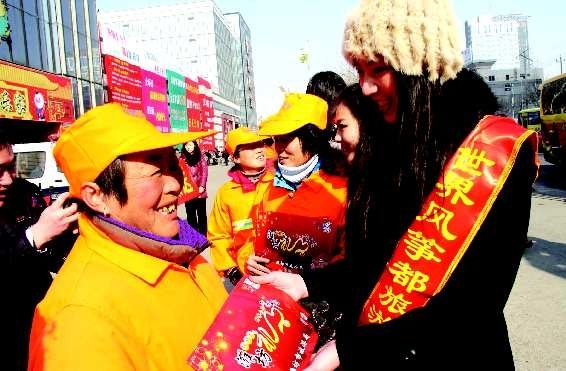 26日,潍坊旅游大篷车奔赴7个站点,向市民派送旅游大礼包。礼包包括潍坊、青岛、日照、济宁等地部分景点的门票,市民可凭此在春节期间逍遥出游。在新华路佳乐家超市门前,形象大使们把“潍坊旅游大礼包”赠给了环卫工人。 本报记者 吴凡 摄
