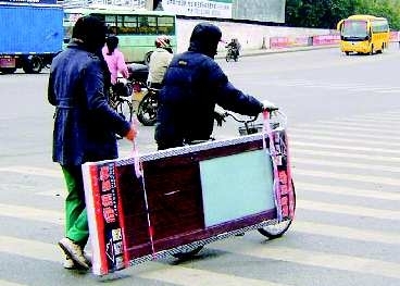 作品描述:把门放于单车脚踏上,用两根绳子绑着,前头挂于把手,后头一人提着走,办法是不错,只是太费劲。