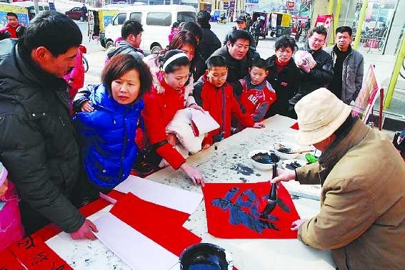 ▲1月25日,在市区某商场广场上,书法家挥毫泼墨写春联免费送。