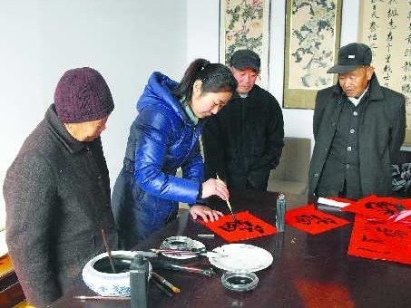 的多名老师给敬老院老人送春联 1月22日在石臼敬老院内凤凰小学