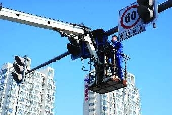 直属大队工作人员正在对信号灯进行更换 1月24日在北京路与海曲东路交汇处交警