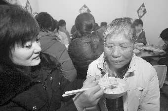 在餐厅里,还有一些智力和精神障碍的流浪者,他们连自己动手吃饭都力不能及,救助站工作人员就端着碗,把水饺送进他们嘴里。
