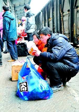 1月27日,临沂火车站二号站台,两位旅客在等车间隙用餐。“小年”前后,临沂火车站迎来客流小高峰,探亲、返乡、放假学生客流叠加出现。记者 罗志强 实习生 卢丹 摄影