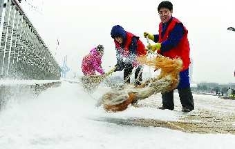在泉城广场,“百姓城管”们紧急上阵扫雪。 本报记者 王媛 摄