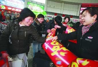 1月28日,旅客从工作人员手中接过大红的“福”字。这一天,公路客运迎来返乡探亲客流高峰,济南长途汽车总站特别为旅客送出大红“福”字,让新春的喜气充满旅途,让更多旅客带“福”还乡。 本报记者 王鸿光 摄
