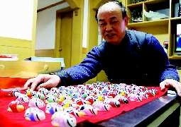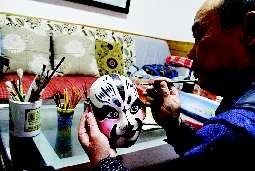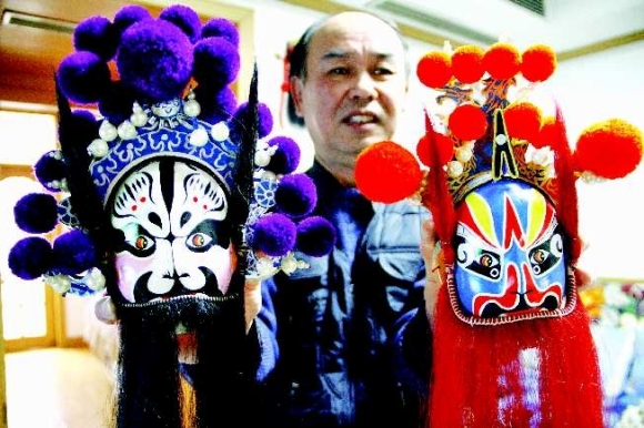最近,张军研究出将京剧脸谱配上服饰,他亲自动手缠弹簧、做毛绒球、串珍珠、编髯口。