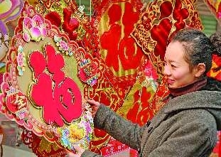 在枣庄,一位市民正在街头卖年货的摊点选购“福”字。 赵慧 吉喆 雪岩 摄