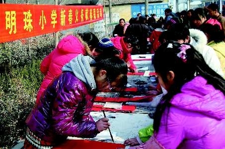 近日,临沂滨河明珠小学组织30余名有书法特长的小学生,开展迎新春义务献春联活动。学校无偿提供纸墨,群众自由命题,孩子们现场挥毫泼墨,仅两个小时1000余副飘着墨香的春联送到了居民手中。通讯员 许金刚王玉亮记者 罗志强摄