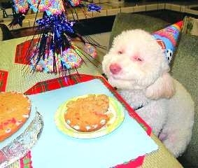 住在美国圣何塞的小狗莱利正在享受生日蛋糕,瞧她迷人的微笑。