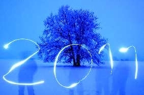 2010年12月30日,德国一摄影师通过长时间曝光拍下的一名男子站在雪地里手持电筒面向蓝色的夜空写出的“2011”。