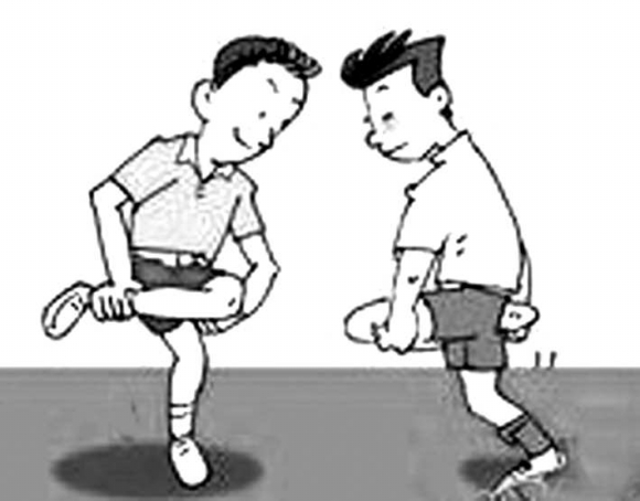 规则说明:不需要任何运动器具,把一条腿抬起来,放到另一条大腿上。用手抱着抬起的脚,单腿在地上蹦。玩的时候大家都用抬起的那条腿膝盖来攻击别人,可以进行单挑独斗,也可以进行集体项目,以脚落地为输。