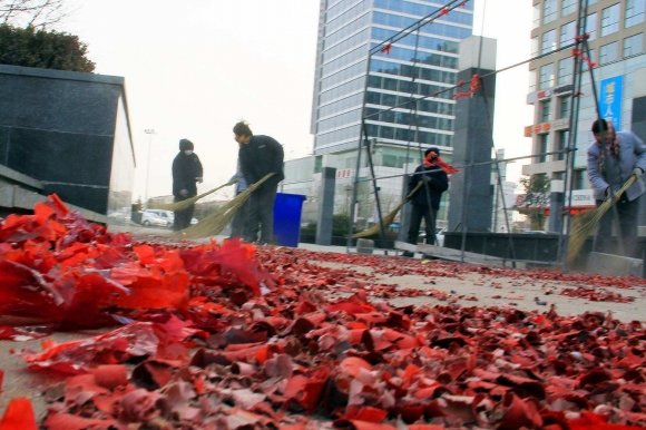 临沂市环卫集团公司办公室的管主任说,春节期间大家燃放鞭炮的习俗是可以理解的,但是希望商户在开业燃放鞭炮时能自己清理一下,不要出现环卫工人前面刚打扫干净,后面又有鞭炮垃圾的情况。