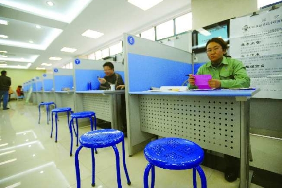 11日,招聘席前供应聘者使用的坐椅都空着。当天,济南市2011年首场“春风行动”专场招聘会在人力资源市场举行,现场有70余家用人单位提供了3千余个岗位。和往年明显不同,今年招聘会上用工单位的热情要远远大于应聘者,应聘者成了用工单位的“宝”,“用工荒”在本次招聘会上有所显现,应聘者让用工方坐了“冷板凳”。