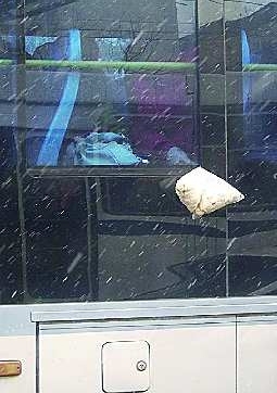 自述:内热外冷,一名乘客把一包水饺放到公交车窗外冻着。