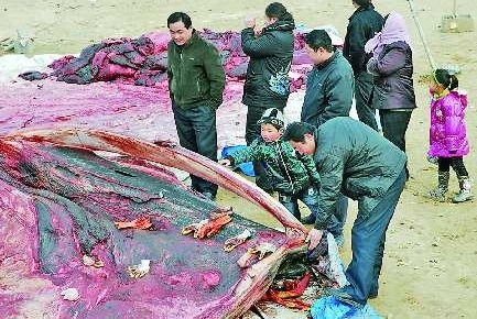 14日上午,日照市水产研究所院内空地上,连云港海洋博物馆的工作人员正在对鲸鱼进行切割。这条鲸鱼的尾部和躯干部被切割成了5段,肉和内脏等杂物已被切割下来放在了场地的边上。从1月19日发现搁浅到2月14日已经过去了将近一个月的时间,标本制作现场长须鲸的内脏、割下来的鲸肉已经开始慢慢变腐,散发出腥臭的气味。