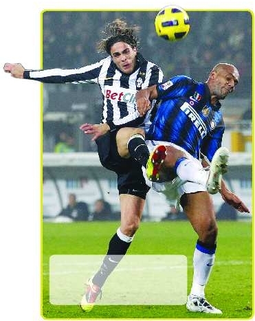 当地时间2月13日,国际米兰队队员麦孔(右)在比赛中与尤文图斯队队员马特里拼抢。当日,尤文图斯队在意甲联赛第25轮比赛中以1:0战胜国际米兰队。新华社供图