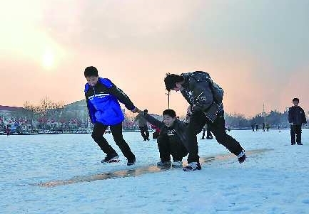 14日,几个男孩在德州新湖的冰面上游戏。随着天气的转暖,冰层将不断融化变薄,孩子们在享受节日生活的同时,不要忘记安全第一。 本报记者 苏超 摄影报道
