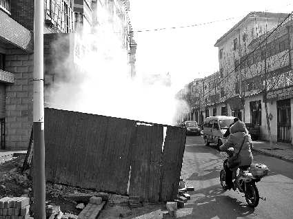 14日,在康乐路宾海首府小区附近,一处供暖管道破裂,大量白色气体往外冒,管道外已经围上一圈铁皮围栏。据了解,围栏已经围上三天,不宽的道路被围栏占去大半,也给周围商家带来诸多不便。 本报记者 李继远 摄影报道