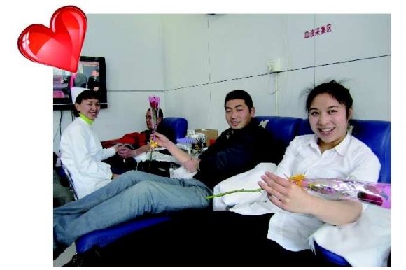 2月14日是情人节,在临沂人民广场附近的爱心献血屋里,一对情侣以献爱心血的方式庆祝节日。当日,市中心血站推出“情人节献血送玫瑰”活动,共有200余人撸袖献血。