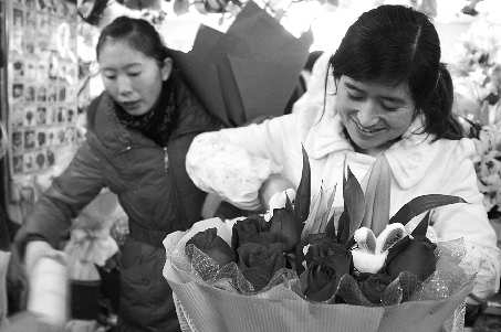 2月14日,东城运河路一家花店内,员工正在忙着包装玫瑰花,买花的顾客把花店挤得水泄不通。店主告诉记者:“为应对2月14日,临时雇了四个人,忙了一整晚,到现在还有很多预订的鲜花没有送完。”