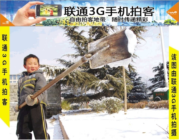 14日一大早,在东岳大街乐园小区附近,一位小朋友正忙着铲雪。