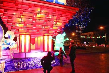 “盛世和韵·欢乐祥和”2011年新春灯会于14日晚在市人民广场顺利试灯,灯展将于15日正式开始,历时8天,市民可在市人民广场和固铂成山体育场欣赏到42组大型彩灯。图为14日晚,市民在广场上欣赏彩灯。