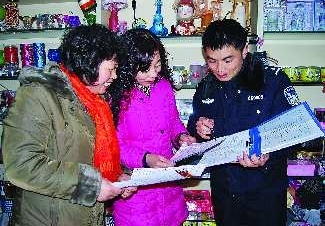 14日,环翠楼办事处红光社区和城里派出所的片警走访辖区内营业网点和流动住户,给他们派发消防宣传手册,并宣传计生知识,还为他们送去元宵节的祝福。