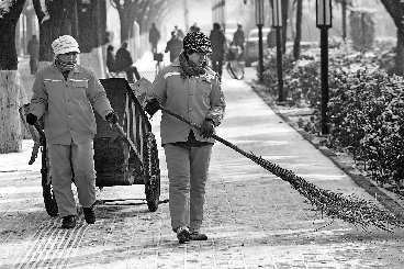 14日早,在济宁市红星路上,两名环卫工脸上挂着微笑清扫路上的积雪。