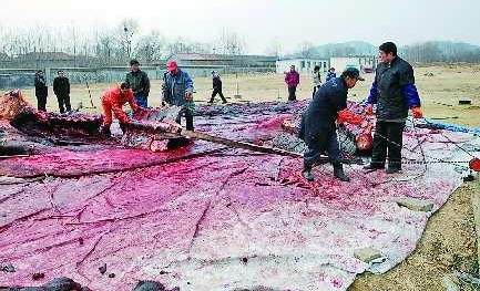 2月14日上午,日照市水产研究所院内,连云港海洋博物馆的工作人员正在有条不紊地对鲸鱼进行切割。这条鲸鱼的尾部和躯干部被切割成5段,肉和内脏等杂物已被切割下来放在场地边上,切割并没有什么特别的工具,用的只是10厘米长的小刀,和一个带铁链滑轮、铁镐、铁丝、绳子等,整个现场比较开放,市民可以随意观看。