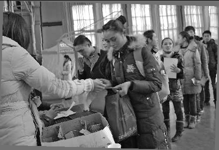 下午1点40分,考生们按照监考人员的安排分批走进球类馆。第一组考生首先来到馆门口右侧的抽签处,凭身份证、准考证进行抽签。“他们的号码都是现场抽取的,这也是保证考试公平、公正,防止考试作弊的措施之一。”曲阜师范大学招生就业处副处长姜晓强说。