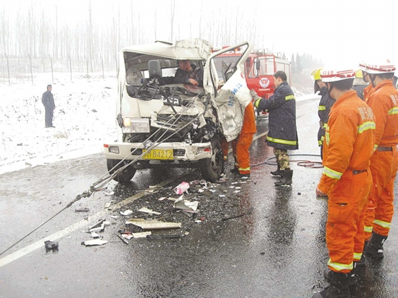 本报96706热线消息(记者 孔红星 通讯员 张柯磊 李金华)2月13日,由于雪天路滑,一辆货车在京沪高速泰安段与一辆罐车发生追尾,驾驶员被困驾驶室,罐车泄漏。泰安消防接到报警后,将被困人员救出,并妥善处理了泄漏情况。