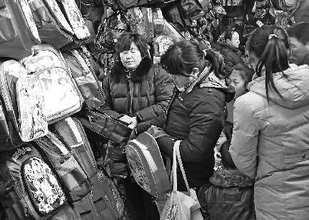 15日,德州城隍庙市场里,几位家长在为孩子选购新书包。新的学期即将开始,不少家长为孩子选购新的文具,为孩子新学期的学习加油提劲。