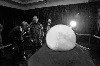 15日,在闽江三路上的荣宝斋,一颗来自宝岛台湾的直径82厘米重1吨的夜明珠亮相,吸引了不少市民前去参观。工作人员打开手电筒吸附其壁照射后,夜明珠就会呈现出手电筒光的形状和光芒。据业内专家估算其价值约10亿元人民币。这颗夜明珠属于中国台湾一位陈姓的地产商人。