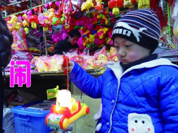 15日,东营市小商品城的一个摊位前,徐女士四岁的儿子买到塑料花灯后立马玩了起来。元宵节马上就要到了,各商场也迎来了花灯销售的高峰。 本报见习记者 王瑞景 摄影报道