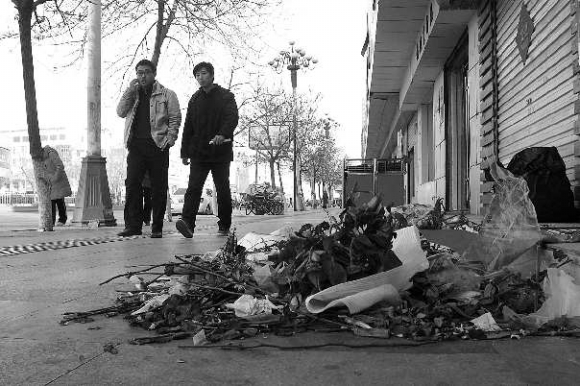 上图:2月15日,记者在济南路看到,一些花店外堆积了很多“鲜花垃圾”。情人节刚过,很多花店却忘记了要及时处理“鲜花垃圾”,这些垃圾不但影响市容,也影响了行人的正常行走。