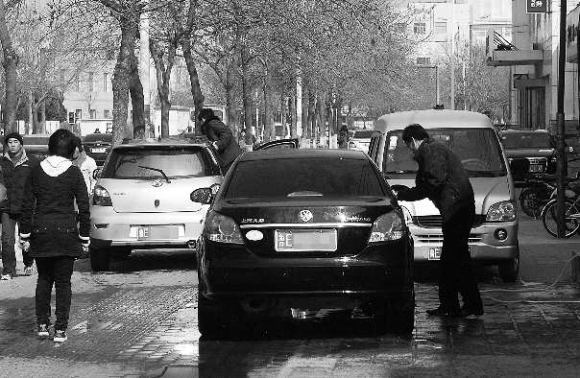 下图:2月15日,记者在胶州路看到,几位市民直接在人行道上洗车,过路行人不得不绕道而行。