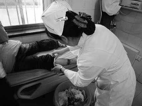据胜利油田中心医院急诊科姚护士介绍,15日下午3时许,医院接诊了这名女孩。外科医生郭隆升介绍,小女孩左小腿胫前有2公分皮肤裂伤,小腿后跟前部与腿胫相对称处有长15厘米的皮肤撕裂伤,软组织处翻开,达到了肌肉层。目前小女孩的伤口不能缝合包扎,只能用大量的生理盐水进行伤口冲洗,再用双氧水进行反复清洗。