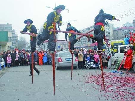 元宵节前夕,民间扮玩———高跷队正在大街上表演。据高跷队负责人介绍,高跷队里有武松、白蛇等造型。而最高的高跷约160厘米,需要表演者经过刻苦训练才能驾驭。该高跷队成员中年纪最大的83岁,最小的9岁。