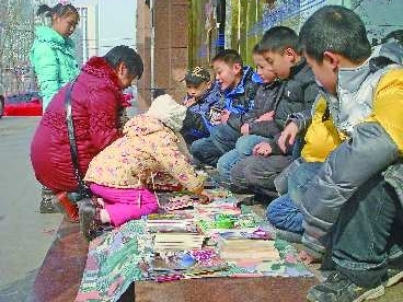 近日,山师大附小五年级四班雏鹰小队的五名同学在路边摆起小书摊,引来很多家长和小朋友淘书。两个小时下来,他们收入百余元,并决定将部分收入捐给班级做班费。 (延杰)