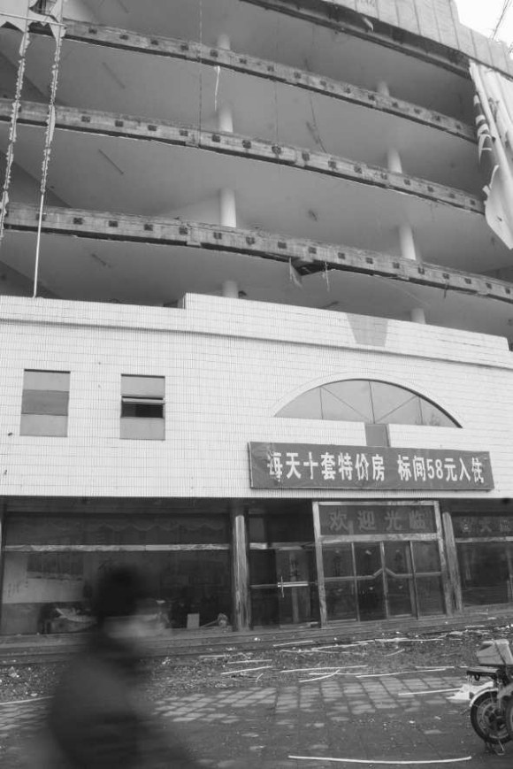 2月14日,付花宾馆的停车场大门紧锁,宾馆楼前地面上,破碎的玻璃混在雪地里。宾馆三层和四层楼上的玻璃已全部被拆去,楼顶“付花宾馆”四个大字只剩下“付花”俩字。