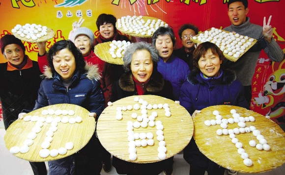 16日,泰前街道嘉德社区的工作人员和社区居民举办了“、过元宵”活动,拉近了邻里关系,增加了节日氛围。图为社区居民用汤圆摆成“元宵节”的字样。