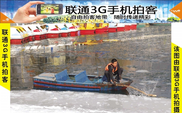 15日,为了保证游人安全划船,虎山水库的工作人员划着小船,在湖面上进行破冰工作。近日的雨雪低温天气造成水面结冰,但冰层很薄,下面都是活水。