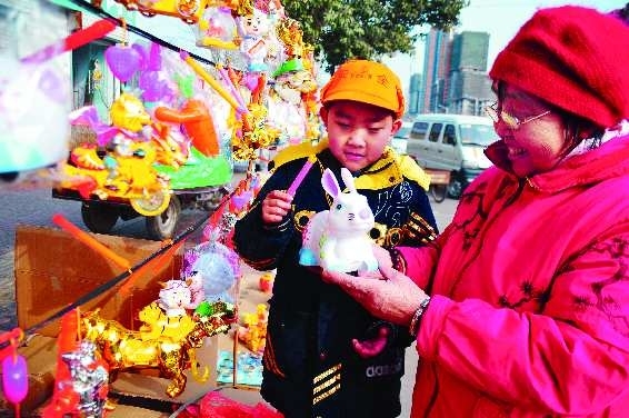 随着元宵节的临近,各种各样的花灯摆上街头。记者发现,传统花灯现在已几乎不见踪影,造型各异的现代电子花灯唱起主角,其中兔子造型的花灯更受人们青睐。 记者 罗志强 摄影