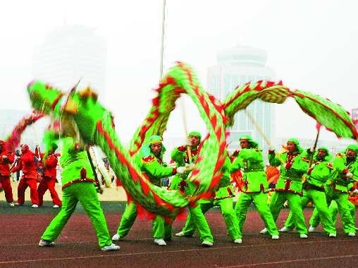 16日,德州市中心广场锣鼓喧天、凤舞龙腾,来自德州三区及临邑县的十余支代表队举行庆元宵民俗文艺展演。