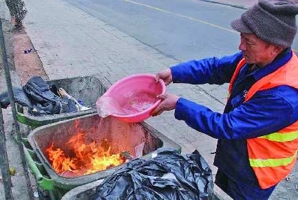 16日,在延安一路,一垃圾桶莫名其妙着起了火。记者随后立即联系了附近的环卫工人,将火浇灭。据环卫工人介绍,前段时间已经烧了一个垃圾桶了。由于垃圾桶是塑料制品,扔烟头等易燃物品前,一定要熄灭后再扔。 本报记者 张晓鹏 摄影报道