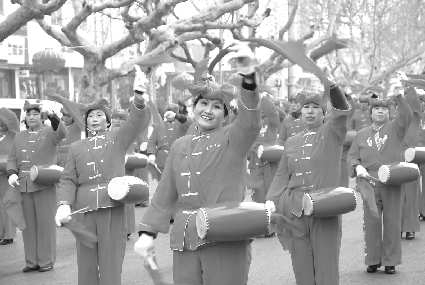 16日上午,在莱阳市举办的2011年迎新春文艺游行活动上,表演现场锣鼓喧天,热闹非凡。划旱船、扭秧歌等数十种表演轮番登场,表演者们个个身披彩服,脸上挂满幸福的笑容,手中挥舞各式各样的表演道具,伴随着有节奏的鼓点扭起来。