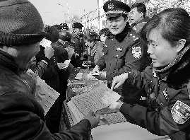 ▲“制售购买假发票是违法犯罪行为”。2月15日,邹城市公安局经侦大队民警在街头向群众宣传识别假发票等知识。 本报通讯员