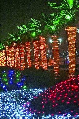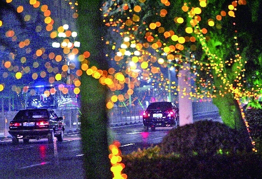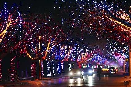 济宁城区的四条主干道太白楼路、红星路、共青团路、建设路沿线的大树上,布满了各种颜色的灯带,霓虹闪烁,灯笼高挂,火树银花,流光溢彩。