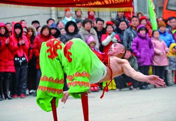 正月里来闹元宵,济南前龙社区闹元宵活动热闹非凡。衣着单薄的王守东正在卖力演出。王守东今年26岁,来自辽宁省盖州市,“趁着还没媳妇,过年出来混点钱……”年初一到初五,王守东一直在大明湖演出,每天像这样仅穿一件小褂演出四场,每场大概20分钟。过了初五,就和济南一家婚庆公司签约演出,穿梭在济南各大社区里闹元宵,“我想过了正月十五就回家,好好孝敬老娘。“王守东自豪地告诉记者。 本报记者 左庆 摄